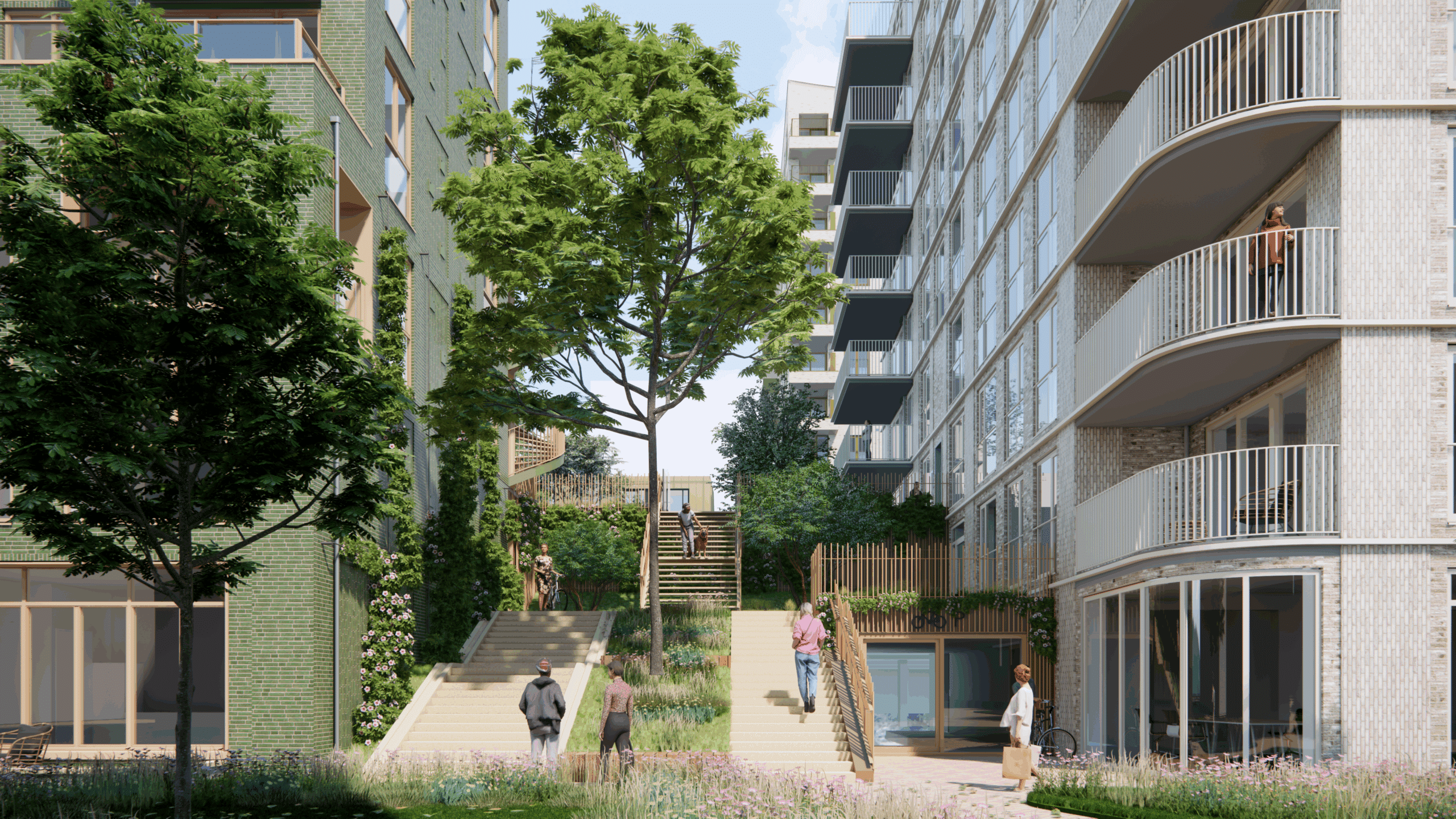 “Omdat onze bouwblokken direct aan het water en het Merwedepark grenzen, voelden we meteen dat hier een bijzondere kans lag. Juist in een hoogstedelijke omgeving konden we toekomstige bewoners een uitgesproken groene woonervaring bieden, door het landschap letterlijk onderdeel te maken van hun dagelijkse uitzicht. De binnentuinen zijn volledig in de volle grond aangelegd, en dat maakte het mogelijk om onze ecologische en klimaatadaptieve ambities écht waar te maken. Zo kun je bomen van formaat planten, werken met meerdere vegetatielagen en een omgeving creëren die niet alleen uitnodigt tot ontmoeting en verblijf, maar ook ruimte biedt aan dieren. Het resultaat is een ontwerp dat zowel rijker als robuuster is”, vertelt Elies.